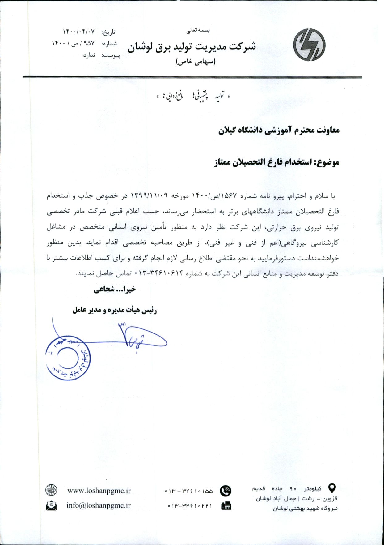 استخدام فارغ‌التحصیلان ممتاز دانشگاهی / شرکت برق لوشان