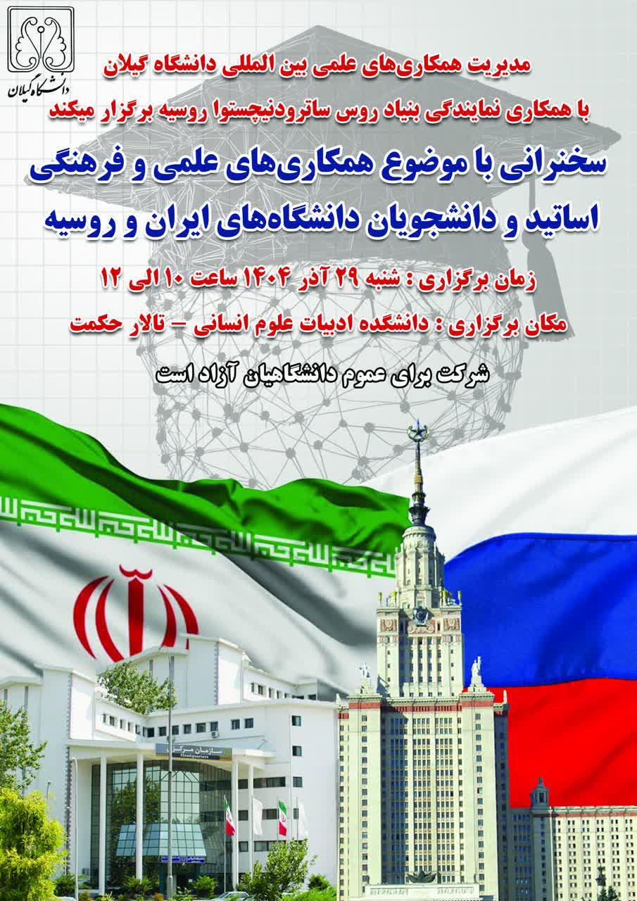 مدیریت همکاری‌های علمی بین‌المللی دانشگاه گیلان با همکاری نمایندگی بنیاد روس ساترودنیچستوا کشور فدراسیون روسیه برگزار می‌کند: